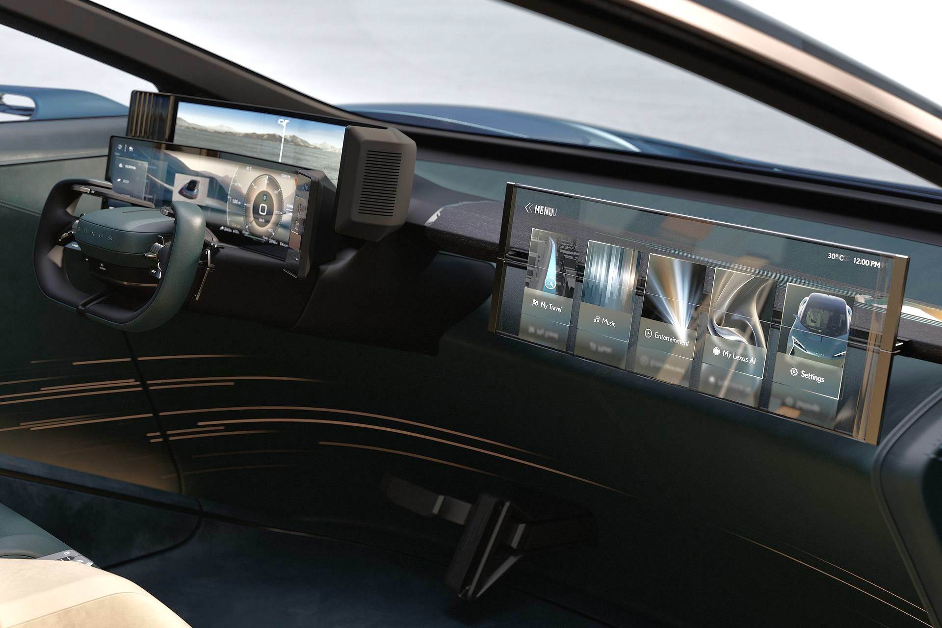Inside, the LS Coupe Concept gets three screens on the dashboard, two of which are layered behind the yoke steering wheel, handling instrumentation and outside camera views; the third one serves as a passenger display. There’s another screen above the front passengers that controls the HVAC system, and it runs right into the huge panoramic glass roof.