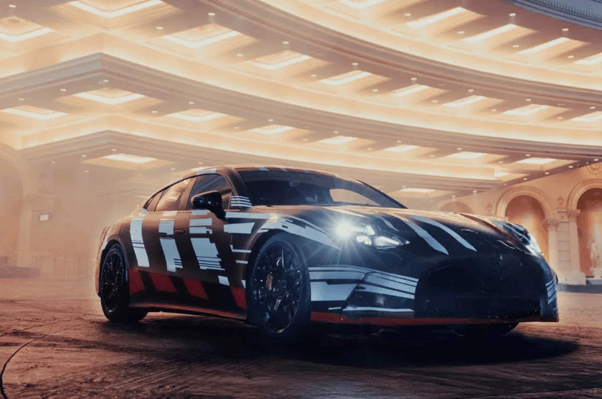 The teaser shows the GT 4-door Coupe EV keeping the long-bonnet, low fastback shape of its ICE counterpart. The EV adopts smoother surfaces, a cleaner front end and flush door handles, all aimed at improving aerodynamic efficiency. The roofline and rear section also appear more streamlined, suggesting AMG has focused on reducing drag for the electric layout.